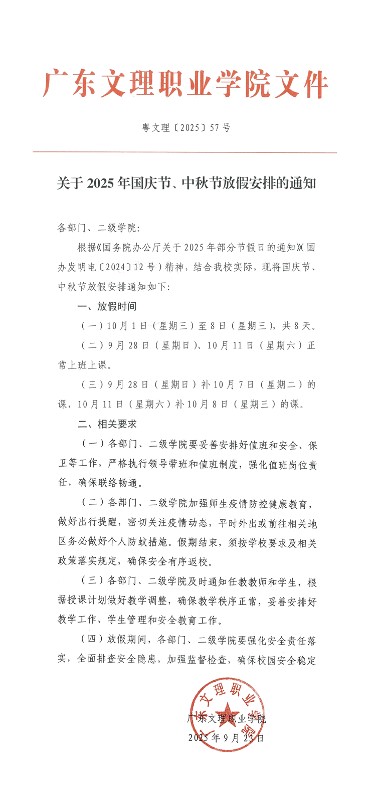 广东文理职业学院关于2025年国庆节、中秋节放假安排的通知