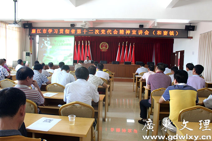 在党的十九大即将召开之际,省第十二次党代会在广州胜利召开,这是我省全面建成小康社会关键时期召开的一次十分重要的会议。为了让广大党员干部全面理解和贯彻本次省党代会精神,近日,廉江市委宣传部从市党校、广东文理职业学院等学校抽调思想政治素质过硬、理论功底扎实的一线教师组成宣讲团,对省第十二次党代会会议精神进行宣讲和解读。