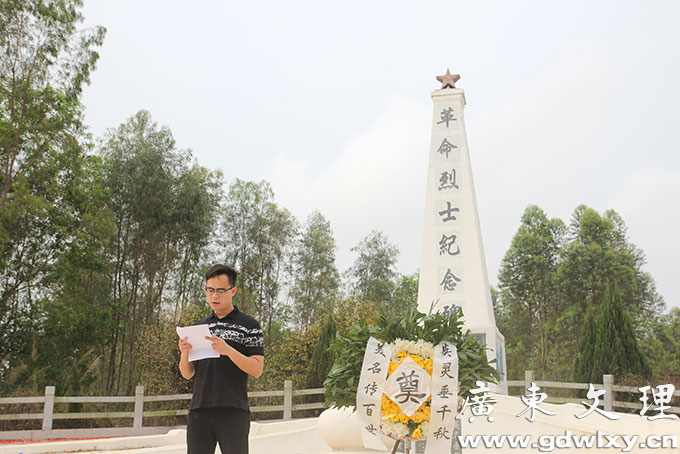 本次仪式由杨云敏和郑智文主持,仪式分为五项流程:团委委员向合江桥革命烈士纪念碑敬献花篮;全体师生面向合江桥革命烈士纪念碑默哀一分钟;学生代表献菊花,并三鞠躬;师生共同聆听廉江黄平民烈士的光荣事迹;最后一项流程由团委社会实践委员黄国盛为我们作扫墓致辞。