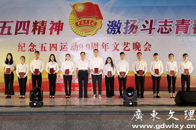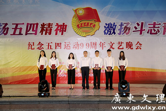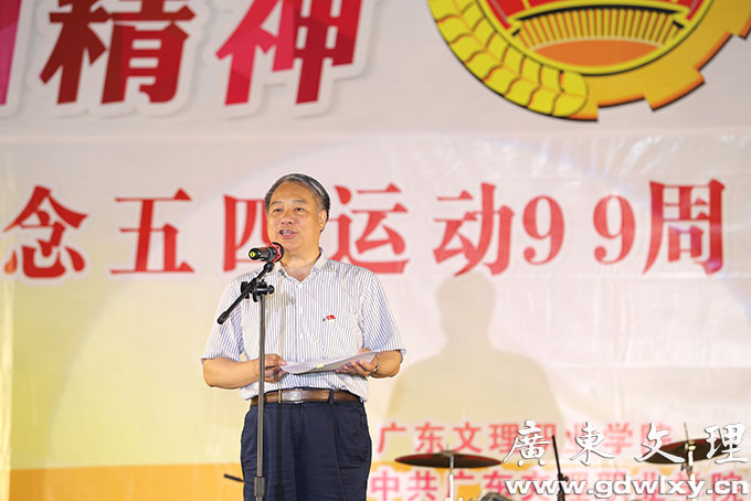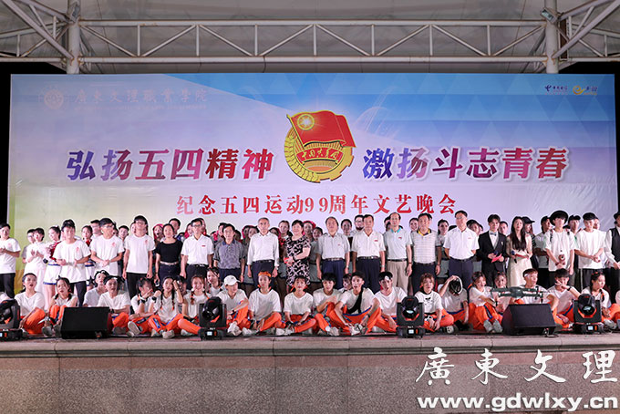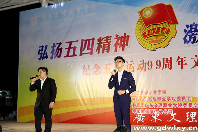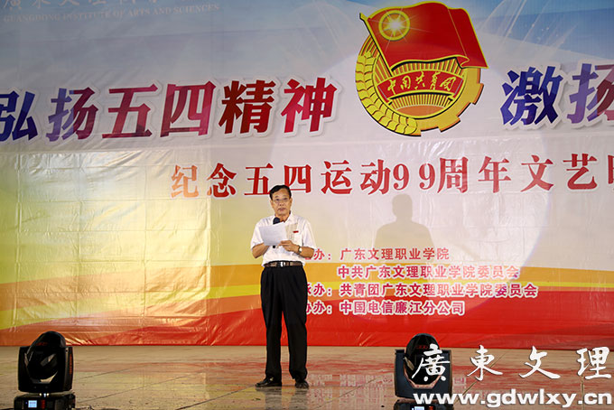 5月4日晚,广东文理职业学院隆在运动场隆重举行纪念五四运动99周年文艺晚会。学院党委书记颜大胜,董事会董事蓝小云,副书记、常务副院长刘周堂,党委委员、副院长王南福,副院长汪富泉,党委委员、副院长涂习贤,工会主席、院长助理宣承柱,党委办公室主任张万新,学生处处长、团委书记刘春杰,教务处处长郝世栋等领导出席晚会,4000多师生观看演出。晚会由陈铭勋、江时姝主持,党委书记颜大胜讲话。
