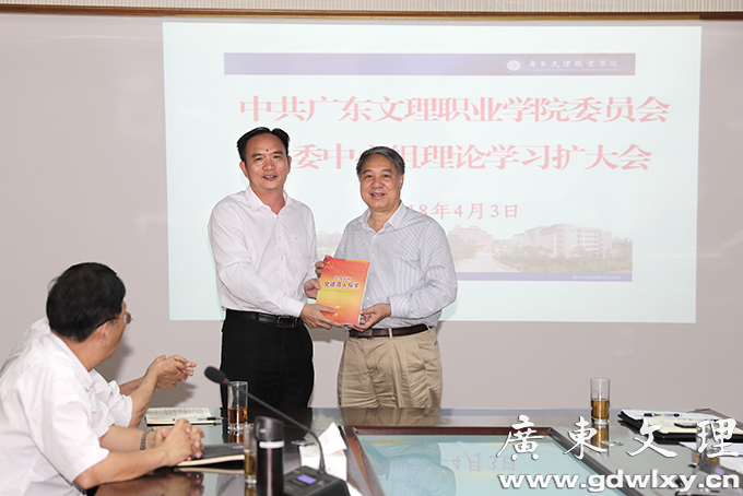 4月3日 下午党委中心组在学院行政楼四楼会议室举行从严治党学习扩大会议。学习扩大会议特邀广东医科大学马克思主义学院院长、社会科学部主任黄祖辉教授做辅导报告。参加学习的除了中心组成员外,扩大到党总支党支部书记及组织委员、宣传委员。学习扩大会议由广东文理职业学院党委书记颜大胜同志主持。
