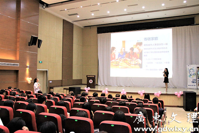 在分享会上,唐璐老师用一张张生动的图片来为大家展示加拿大汤姆孙大学的校园环境、现代化的学习条件、温馨优越的住宿条件等,并着重介绍了夏令营项目,希望通过游学体验生活,增加同学们的国际视野。唐璐老师还与同学们进行了互动,用亲切幽默的语言回答了学生提出的问题。