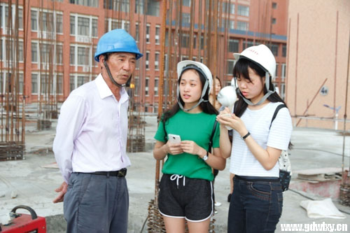 图为在我院学生公寓建筑工地上,项目部魏工程师(左一)在接受2013级新闻采编与制作专业学生的采访