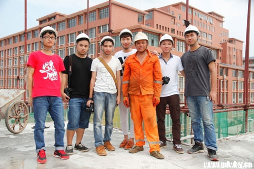 图为在我院学生公寓建筑工地上,2013级新闻采编与制作专业学生在采访结束后和工人师傅合影
