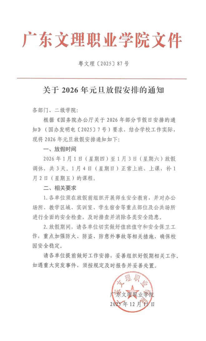 广东文理职业学院关于2026年元旦放假安排的通知