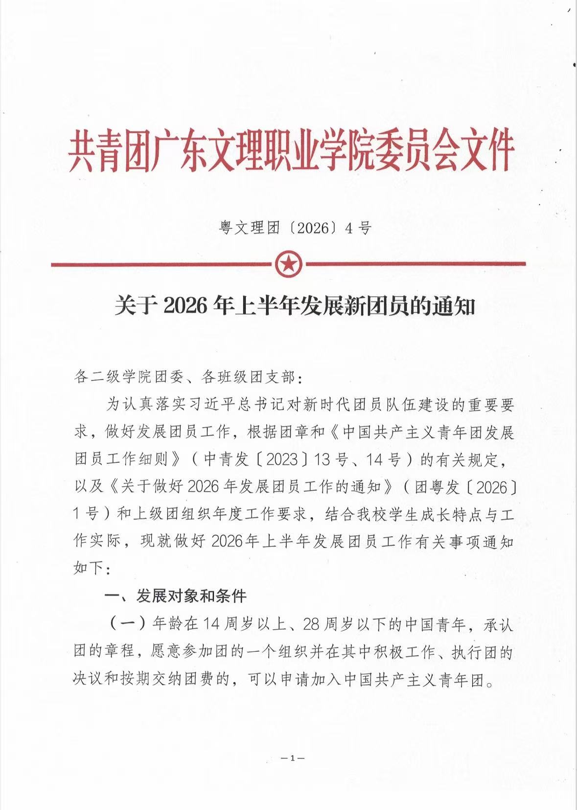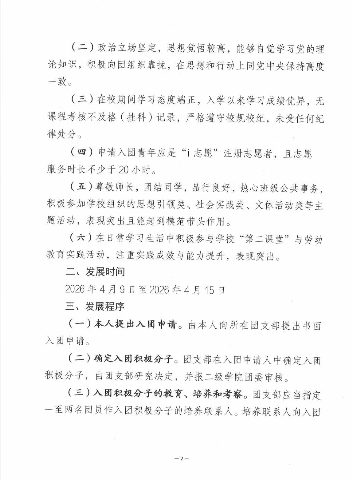 为进一步壮大团员队伍,夯实共青团组织基础,吸纳更多优秀青年加入团组织,增强团组织的凝聚力和战斗力,根据《中国共产主义青年团章程》有关规定和年度工作安排,现就2026年上半年发展新团员工作有关事项通知如下: