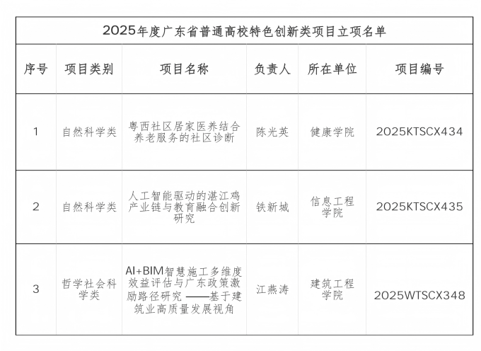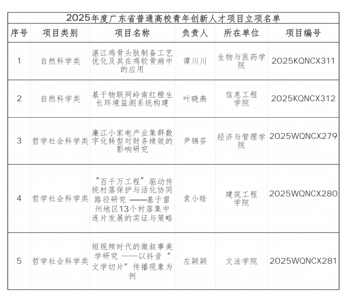 近日,广东省教育厅正式公布了2025年度普通高校认定类科研项目立项名单。经评审与公示,我校共有八个项目成功立项,其中包括三项特色创新类项目和五项青年创新人才类项目,涵盖人工智能、生物医药、养老服务、乡村发展、文化产业等多个重点领域。