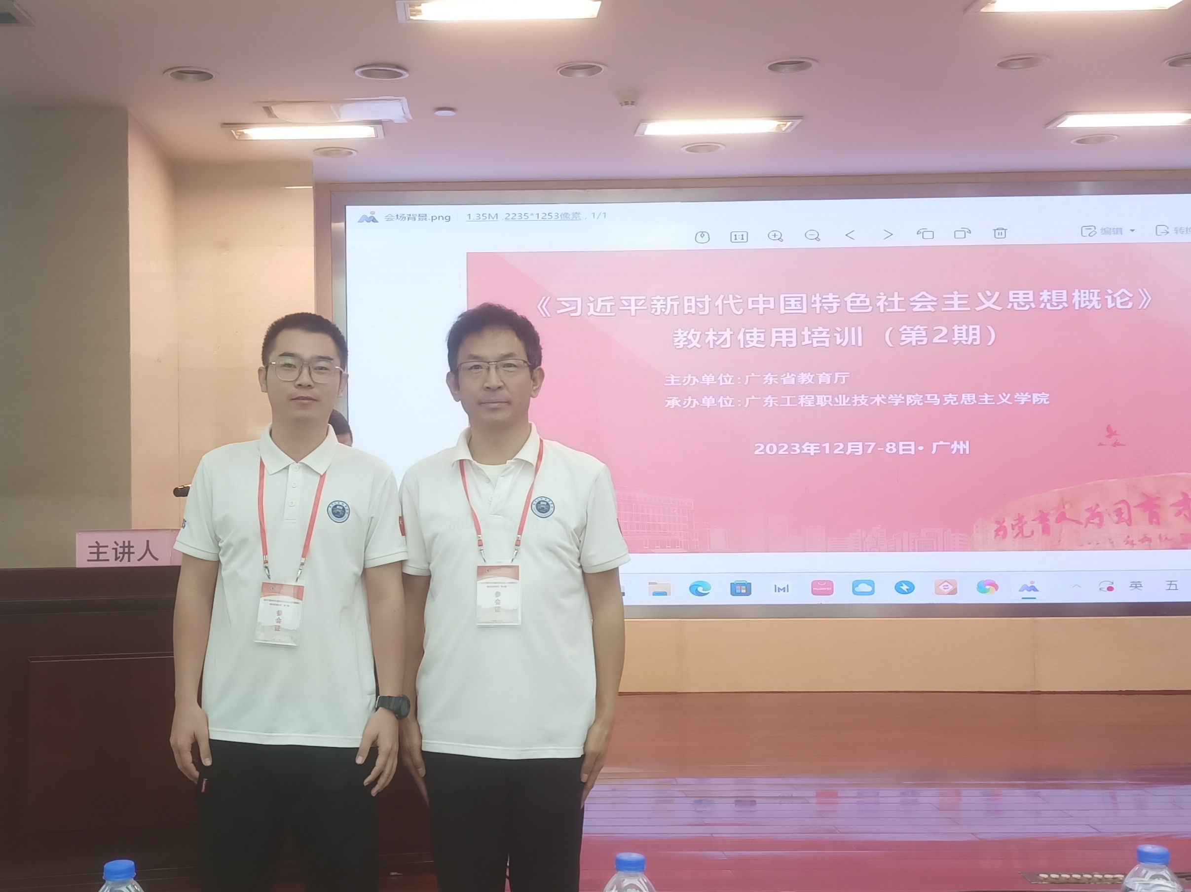 为了更好的推进“新思想”的“三进”工作,提升思政部骨干教师教学水平,2023年12月8日,思政部金光贤和王紫洋两位老师参加了由广东省教育厅主办、广东工程职业技术学院承办的2023年广东省高职院校“新思想”课教材使用第二期骨干教师培训班。