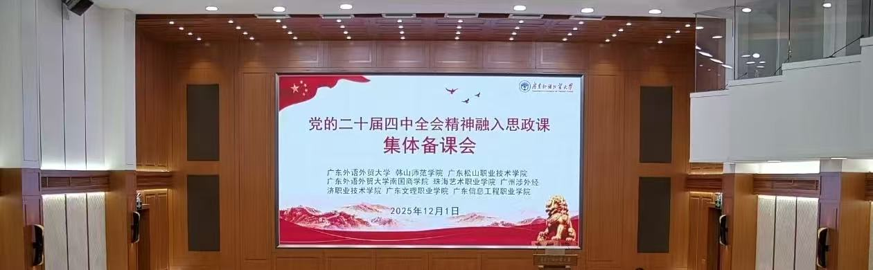 为深入学习宣传贯彻党的二十大届四中全会精神,推动习近平新时代中国特色社会主义思想进教材、进课堂、进头脑,2025年12月1日上午,广东外语外贸大学主办了“党的二十大届四中全会精神融入思政课”集体备课会。本次备课会以线上线下相结合的方式举行,主会场设在广外白云山校区国际会议厅。广东文理职业学院马克思主义学院组织全体教师通过线上方式全程参与学习。