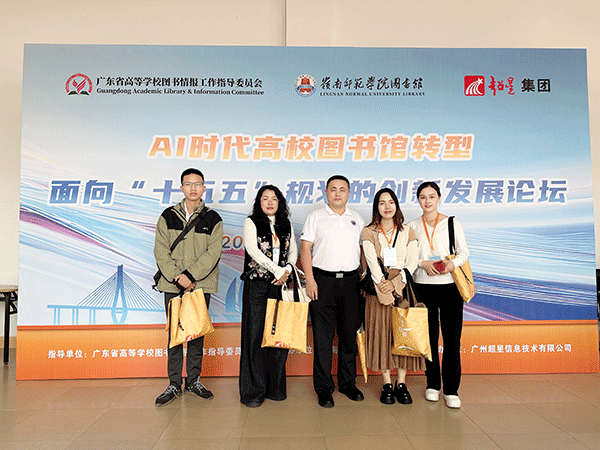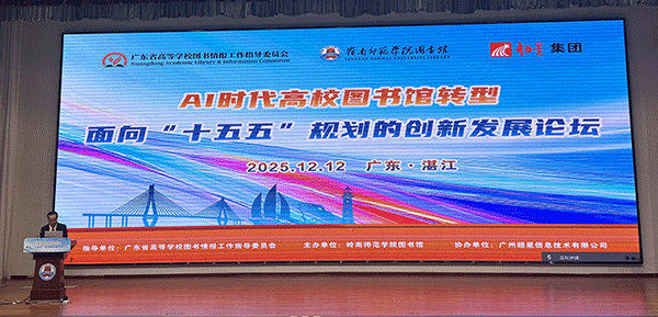 2025年12月12日,刘锋副馆长一行应邀参与了由岭南师范学院主办、广东省高等学校图书馆情报工作指导委员会指导、广州超星信息技术有限公司协办的“AI时代高校图书馆转型高峰论坛”。
