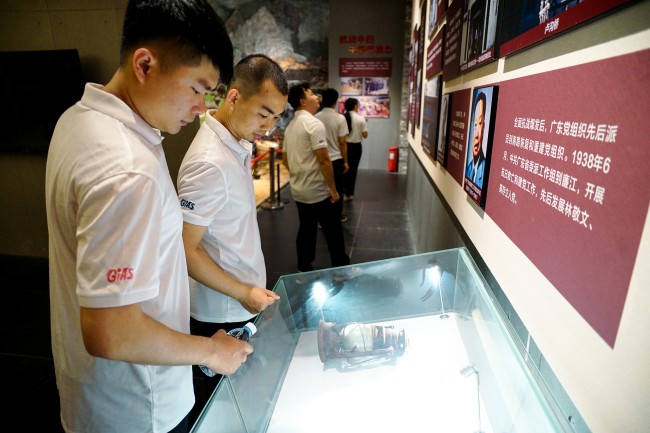 党员们在教育基地讲解员的引导下参观了中塘村红色革命纪念馆。馆内一件件文物和一张张照片所呈现的红色往事,深切领悟中国共产党人历久弥坚的初心使命和奋斗精神。大家通过馆内的陈列品、重大事迹展示栏和浮雕等,深刻认识了廉江南路革命历史。