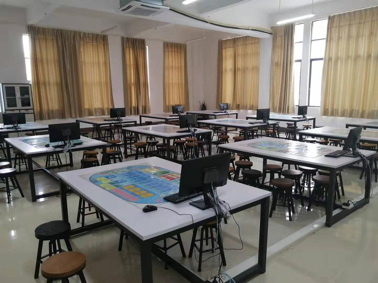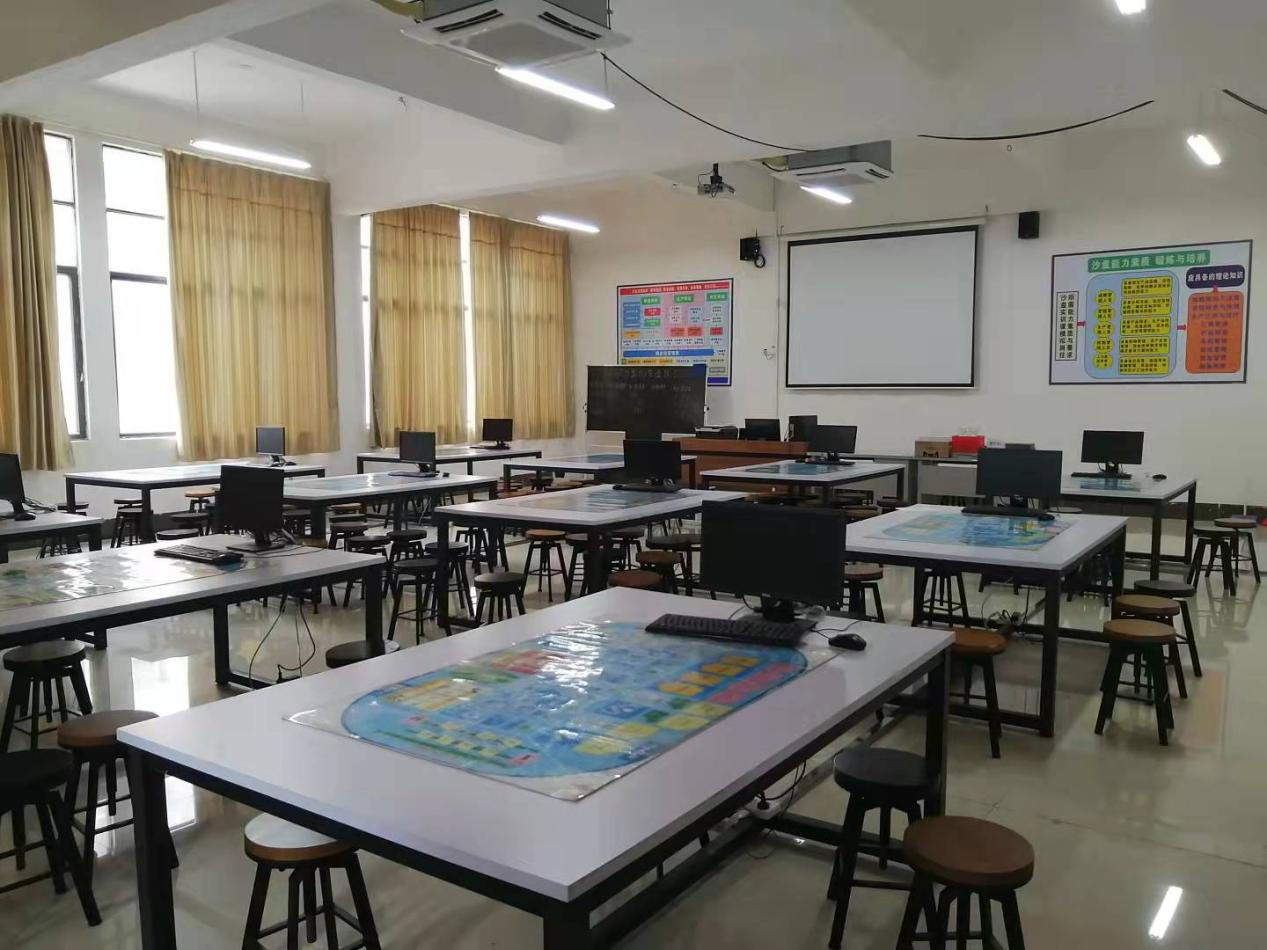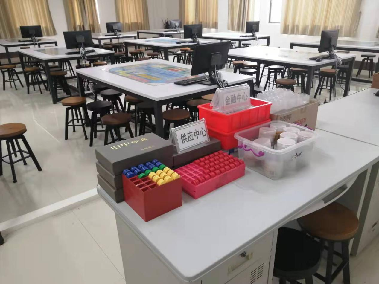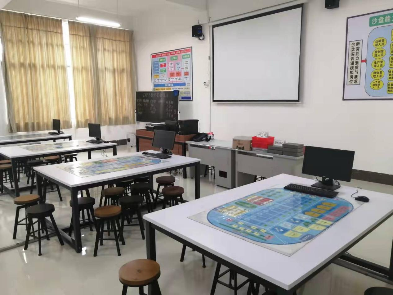 本实训室建成于2016年并投入使用,面积300平米,有实训区和教学区两部分,能容纳60人同时上课与开展实训。其沙盘教具主要包括:沙盘盘面12张,代表12个相互竞争的模拟企业;各种沙盘配件标示12组。