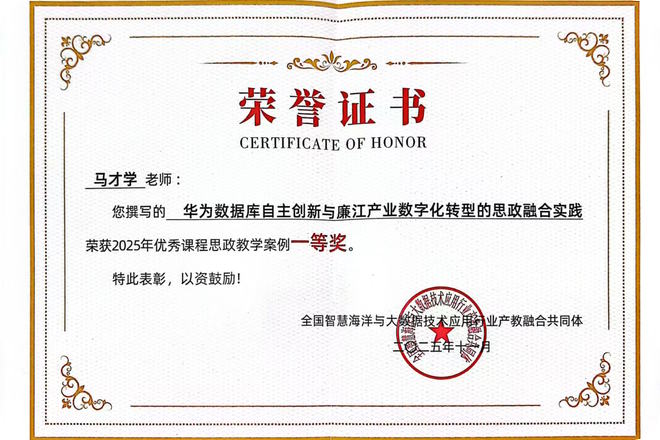 会议还举行了全国智慧海洋与大数据应用行业产教融合共同体课程思政教学案例颁奖典礼,对优秀教学案例予以表彰。在本次颁奖表彰中,我院马院长申报的课程思政教学案例荣获一等奖,叶晓燕老师的案例荣获二等奖,李炳武、曹伯智、梁河金、黄国怡四位老师的案例分别荣获三等奖。