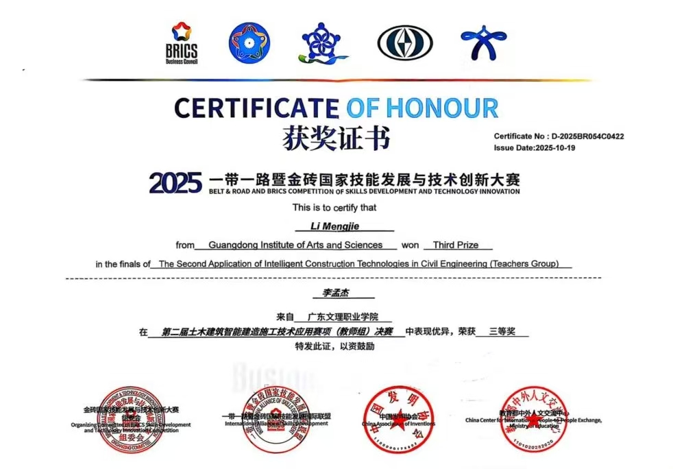 在“2025一带一路暨金砖国家技能发展与技术创新大赛——第二届土木建筑智能建造施工技术应用赛(教师组)”中,我校建筑工程学院李孟杰老师凭借扎实的专业功底和对土木建筑智能建造技术的深入研究,在赛事中脱颖而出,荣获国赛三等奖。该赛事紧密对接行业前沿,重点考察选手在智能建造技术方面的综合应用与创新解决能力。此次获奖,既是其个人专业能力的卓越体现,也是学校在推动土木建筑专业智能化教学改革中结出的硕果。