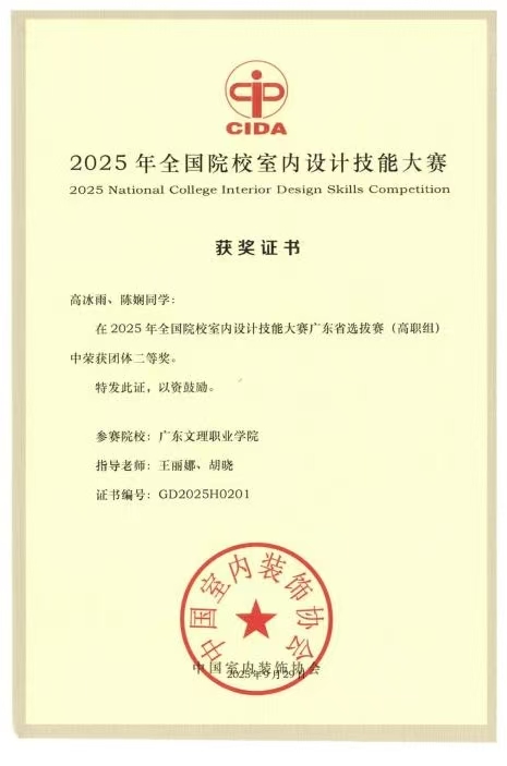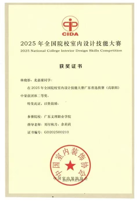 在中国室内装饰协会主办的“2025全国院校室内设计技能大赛”广东省选拔赛(高职组)中,我校建筑工程学院学子表现尤为亮眼。由高冰雨、陈娴与林晓彤、龙嘉濠组成的两支参赛队伍,凭借出色的设计创意、扎实的技能应用和默契的团队协作,双双荣获“团体二等奖”。作为室内设计领域的权威赛事,本次比赛竞争激烈,学子们的出色成绩,有力印证了他们在专业学习上的深度与精度,同时也是我校室内设计专业坚持“以实践为导向、以创新为核心”教学理念的成功实践。