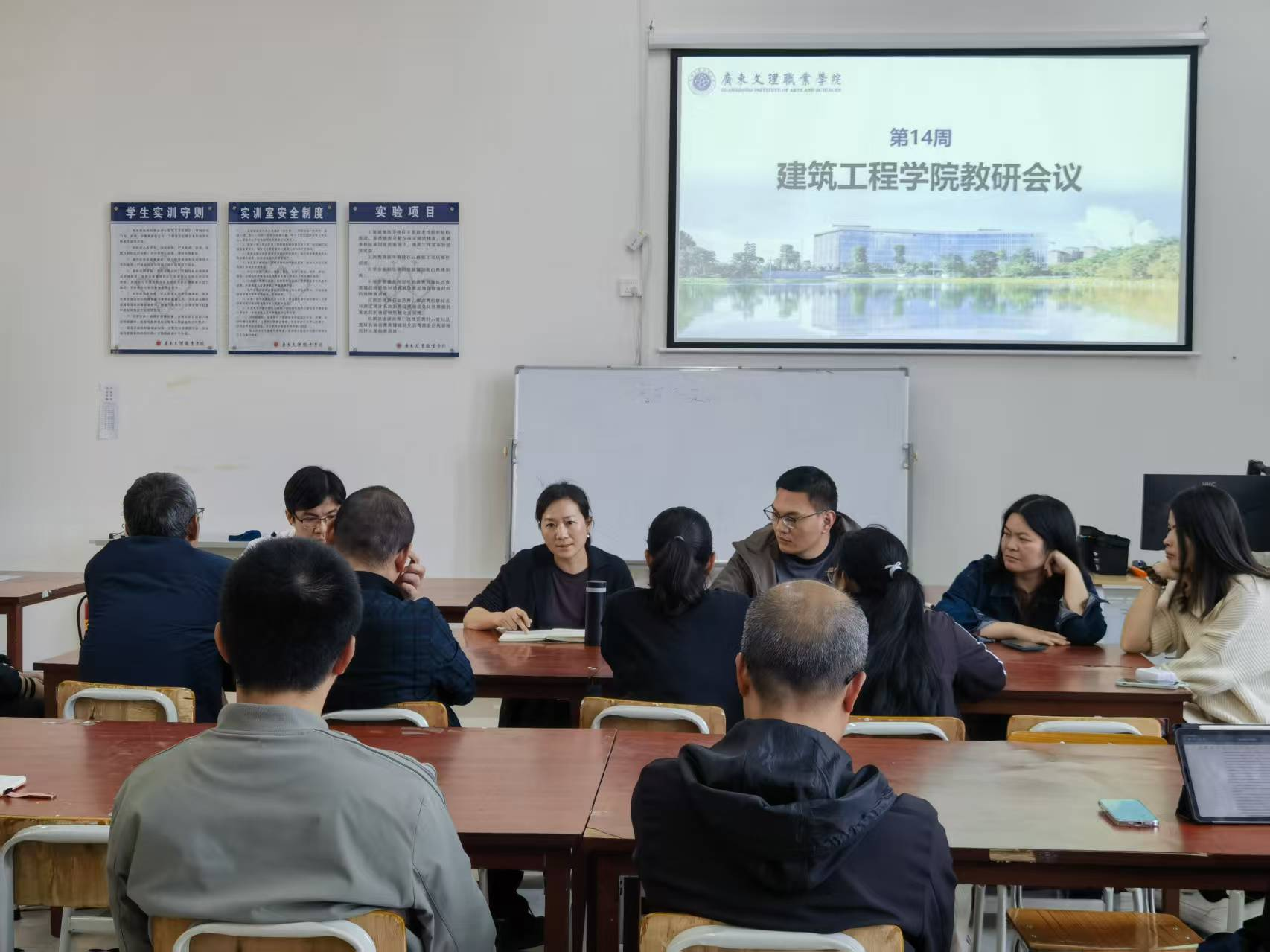 2025年12月3日,建筑工程学院在实训楼D111教室召开第十四周教研活动。本次会议围绕“传达校领导调研精神、部署毕业生实习工作、安排期末日常工作”三项核心议程展开,旨在统一思想、细化举措、压实责任,为学期末各项工作平稳有序开展提供保障。会议由余莉莉副院长主持,全体专任教师参加。