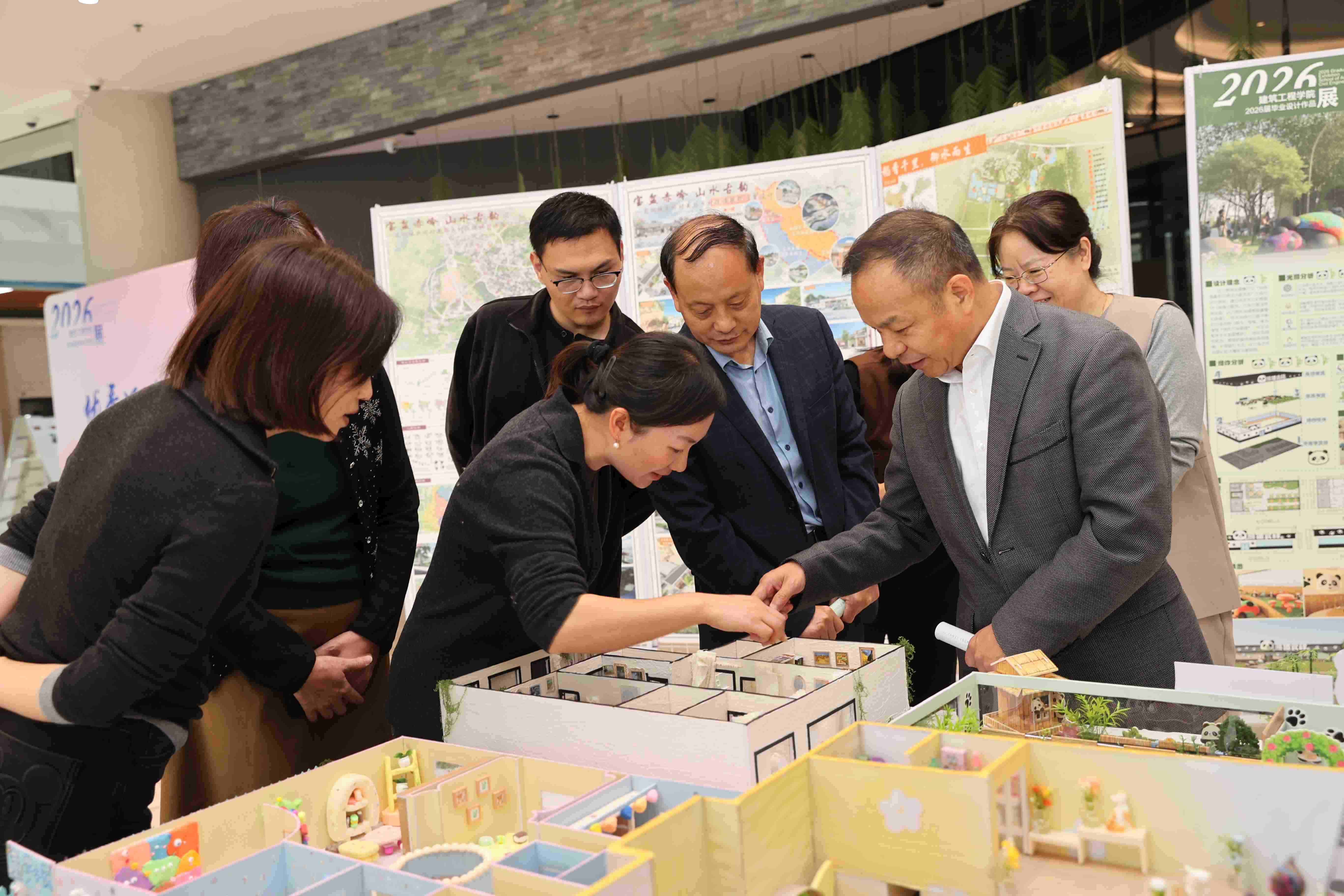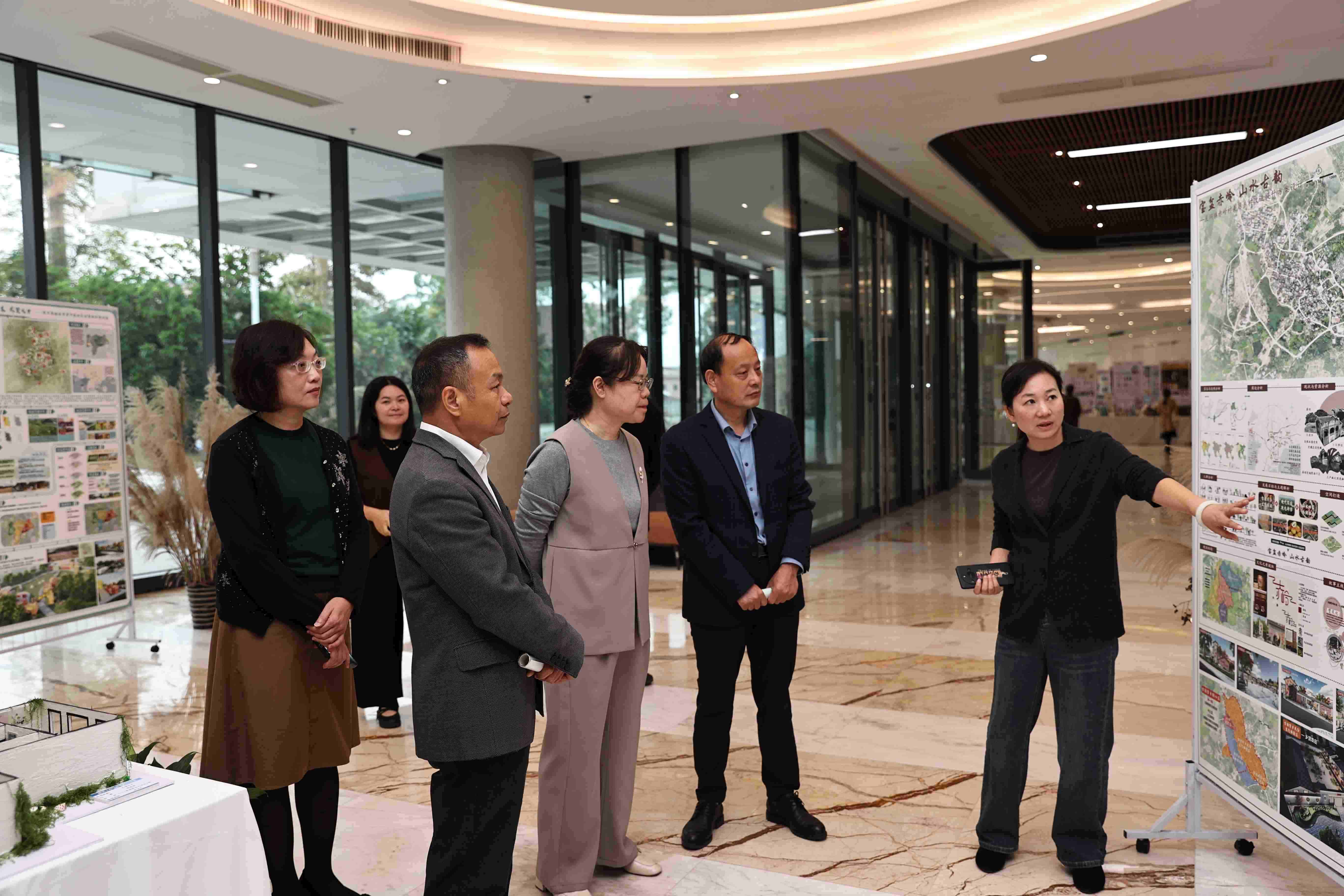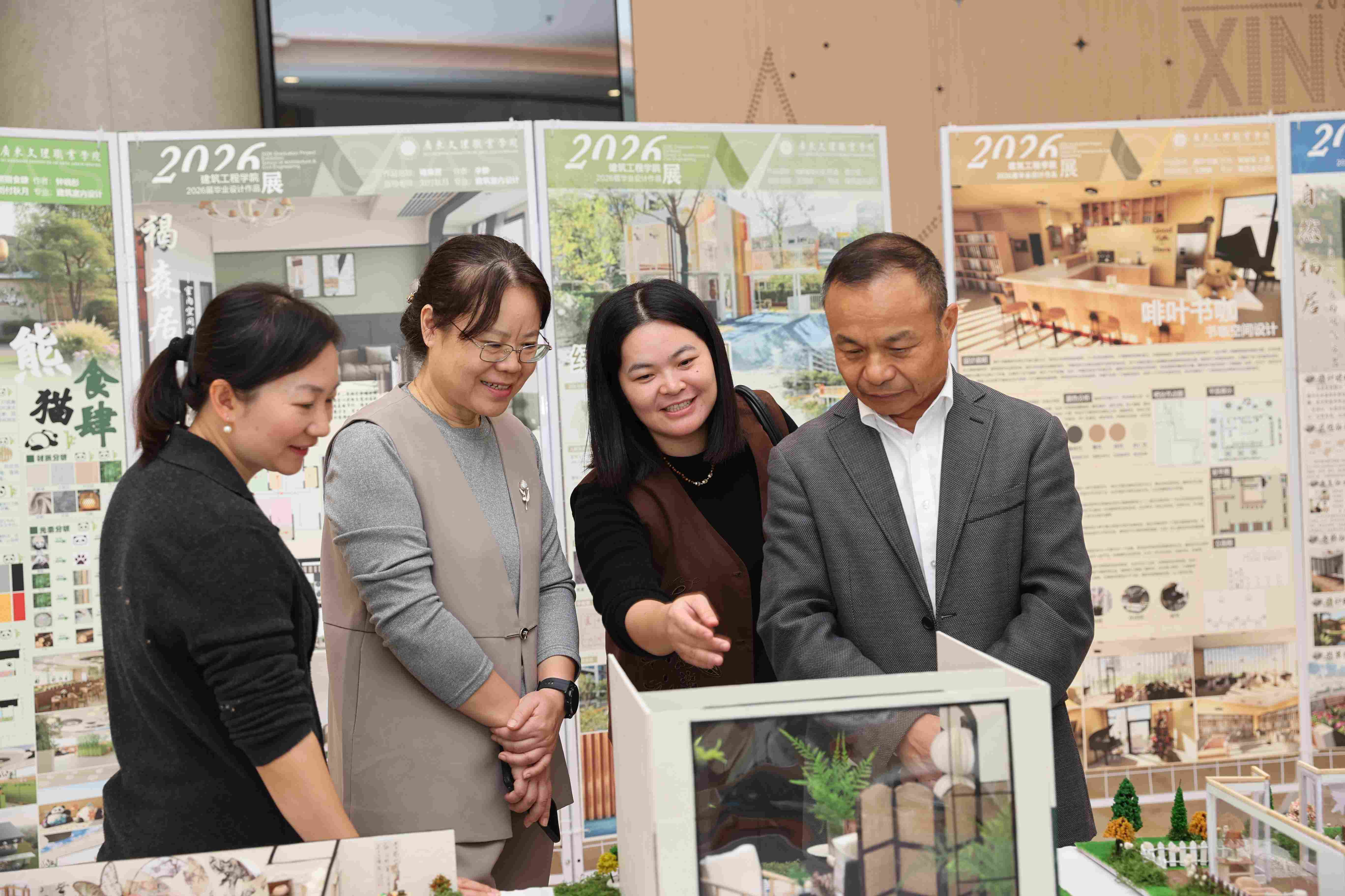 本次展览集中呈现百余件优秀作品,涵盖“粤美乡村”风貌设计大赛获奖作品,2026届建筑室内设计、环境艺术设计、村镇建设与管理及建筑设计专业毕业学生的优秀设计作品、2024级学生优秀手绘作品,生动展现了学子们立足乡村振兴、数智赋能的时代背景,在艺术审美与科技应用融合领域的探索成果。校领导一行逐区驻足观摩,认真听取教师关于作品设计理念、创作思路及实践价值的讲解。