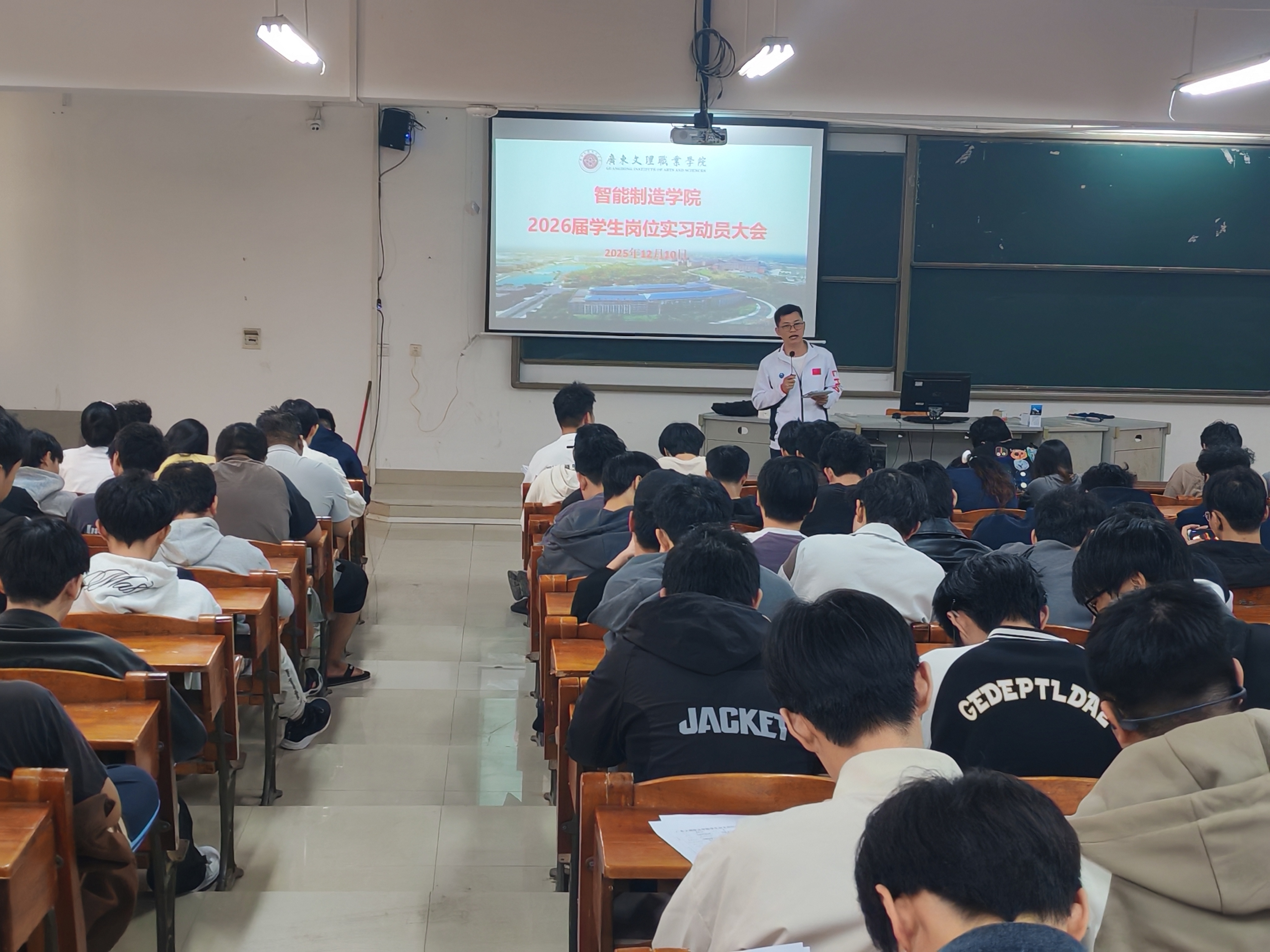 2025年12月10日,智能制造学院于第一教学楼分场举行了2026届学生岗位实习动员大会。学院领导杨根喜副院长、李清伟副院长、袁孟院长助理、教研室主任、辅导员及千余名应届实习生共同与会,标志着本年度学生实习工作全面启动。