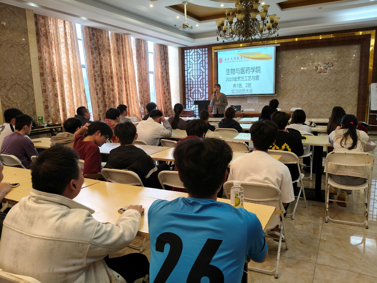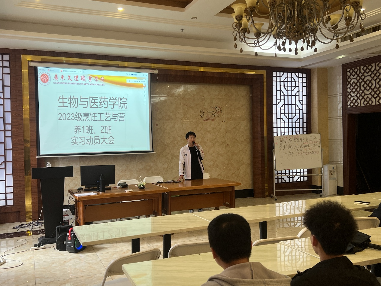 为保障毕业实习工作有序推进,让师生明确实习的意义、目标与核心任务,12月4日,生物与医药学院在汇珍苑三楼酒店管理实训室隆重召开2026届烹饪工艺与营养专业毕业实习动员大会。各班实习指导老师、辅导员周文丹老师和张广豪老师及全体实习生参加会议。