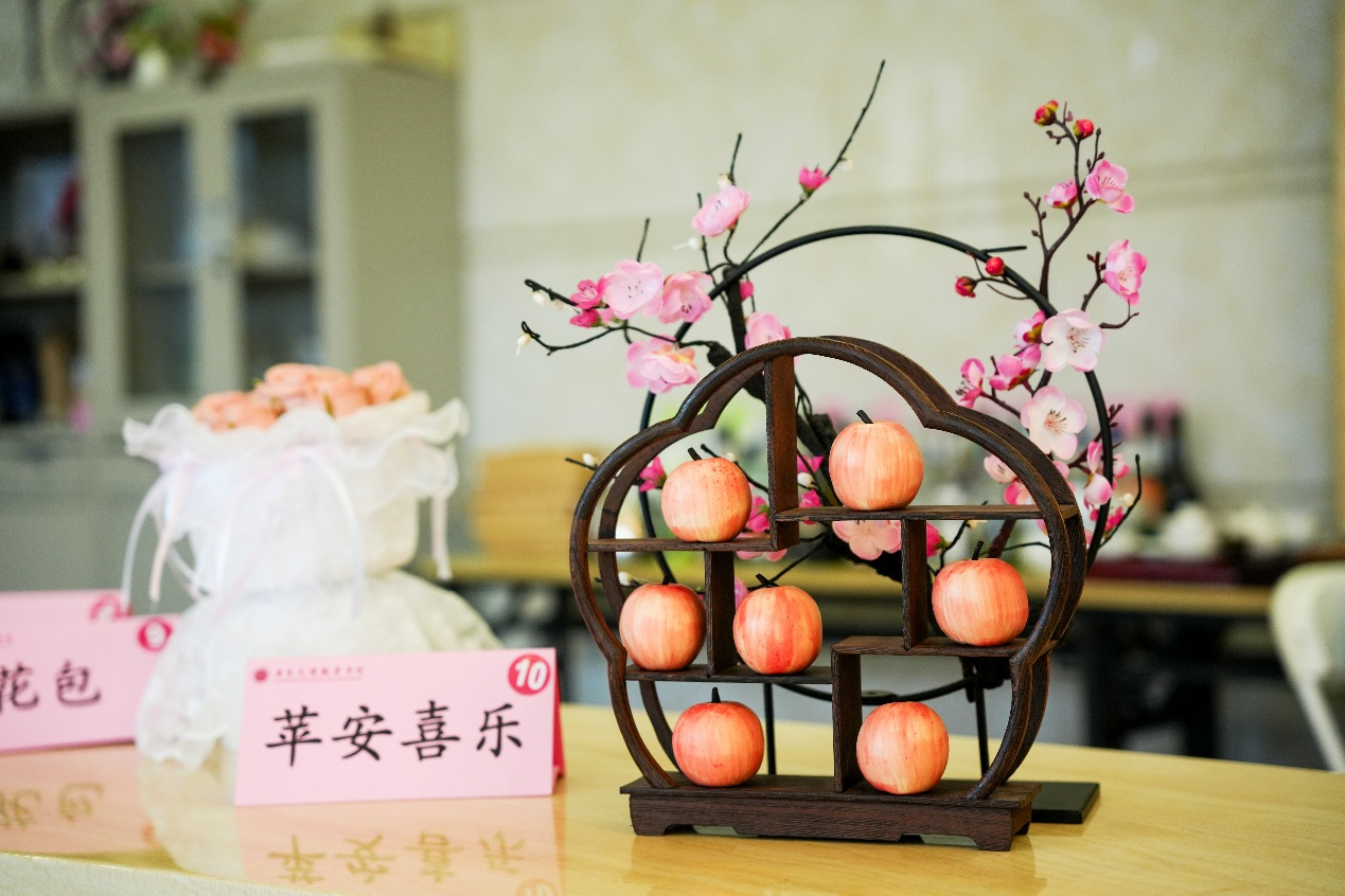 面点竞赛区以24级学生为主,两人为一组,共30人参赛。面点赛场则宛如一场“象形艺术展”,选手们以面粉为笔、馅料为墨,将寻常面点化为栩栩如生的创意作品。象形包项目要求选手兼顾造型逼真度、口感蓬松度与营养合理性,从食材配色到捏塑技法,每一处细节都彰显匠心。赛场之上,南瓜泥、菠菜汁、紫薯泥等天然食材赋予面团丰富色彩,选手们指尖翻飞间,花鸟鱼虫、瓜果蔬果跃然盘中:“仿生苹果包”色泽粉嫩,形状自然;还有充满童趣的“果蔬萌宠包”。所有作品均采用天然食材调味着色,在保证口感松软的同时,实现了“色、香、味、形、养”的和谐统一,让观众不禁赞叹“面点也能成艺术品”。