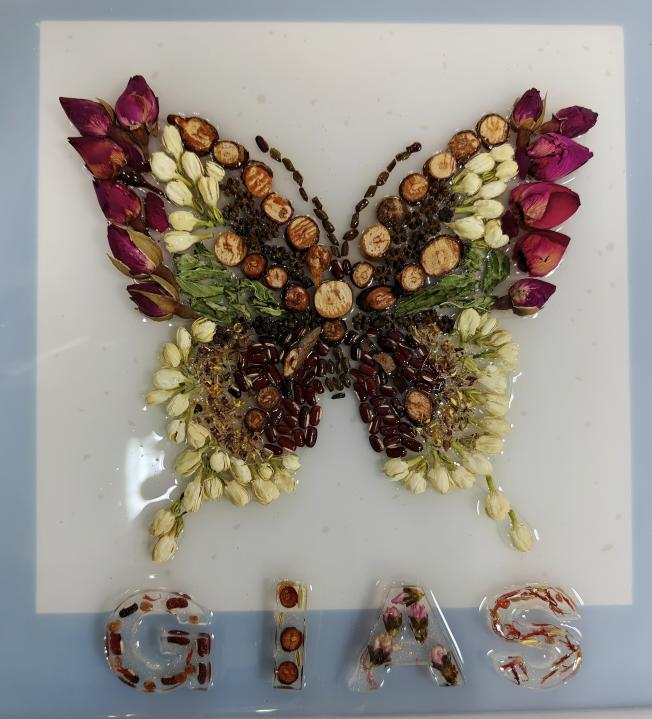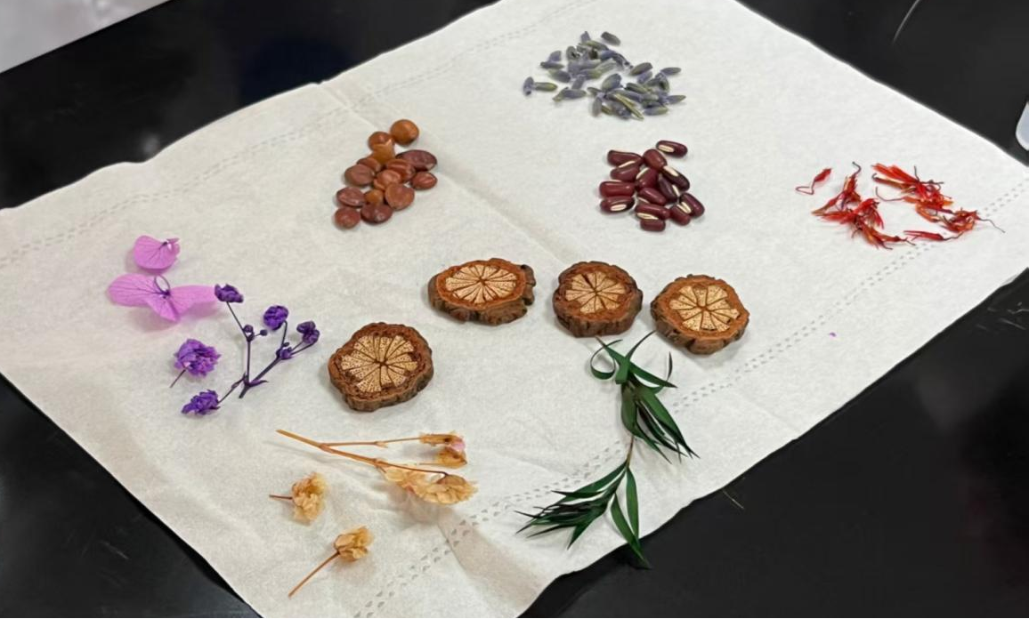 赛后,叶静麒同学分享了作品的创作灵感:“我们队的作品主题是‘本草蝶舞之花语药韵’,选取了茉莉、玫瑰、桂花勾勒花之姿,以决明子、薄荷、红豆、吴茱萸铺展药之韵,既借蝴蝶翩跹的形态展现中药素材的自然美学,也通过这些药材疏肝理气、清热明目、温中止痛的不同功效,诠释中医药‘药食同源、辨证施治’的智慧。”