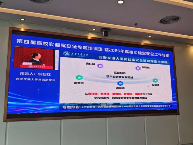 西安交通大学常务副校长别朝红重点介绍了西安交大实验室安全管理制度的五链融合,五链包含责任链、制度链、监督链、教育链、保障链,并且在工作中落实三管三必须(管行业必须管安全,管业务必须管安全,管生产经营必须管安全)。