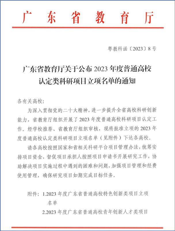 近日,广东省教育厅公布了2023年度普通高校认定类科研项目立项名单,我校8个项目获得立项,其中特色创新类项目3项,青年创新人才类项目5项。项目名单见表1。
