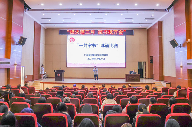 2023年12月20日下午,广东文理职业学院在实训楼十楼报告厅举行了一场别开生面的“家书咏诵”比赛。党委书记陈健、副校长李晓豁、人事处长张飞燕、督导室主任刘贵昂、生物与健康学院院长陈道海、思政部主任李觐出席活动,并作为比赛评委为选手打分。