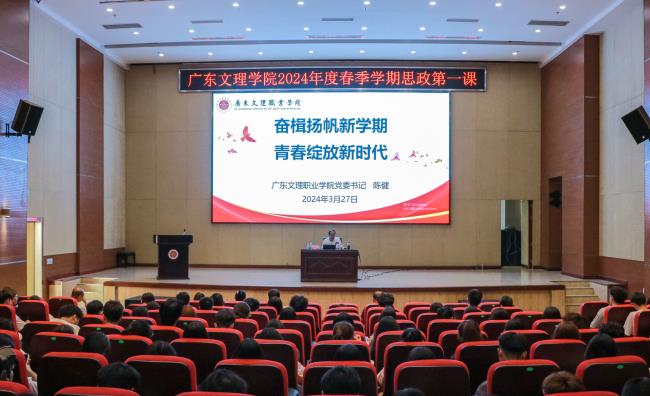 2024年3月27日,广东文理职业学院党委书记陈健以《奋楫扬帆新学期 青春绽放新时代》为主题给全校学生授课。陈健书记从三个方面鼓励同学们充分把握新学期的大学时光,激励大家逐梦新时代、奋进新征程,在学业上实现新突破。