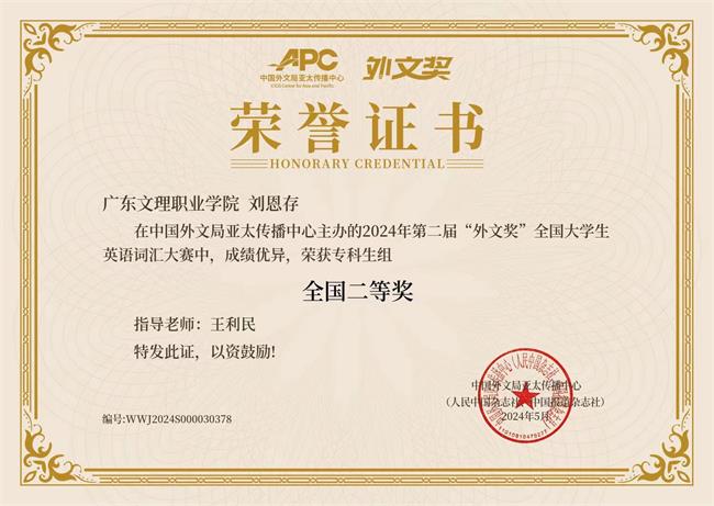 2024年6月2日,广东文理职业学院鼎利学院学生莫君泽荣获第十五届蓝桥杯全国软件和信息技术专业人才大赛全国总决赛Python 程序设计大学 C 组三等奖,体育学院学生刘恩存荣获2024年外文奖全国大学生英语词汇大赛专科生组全国二等奖。