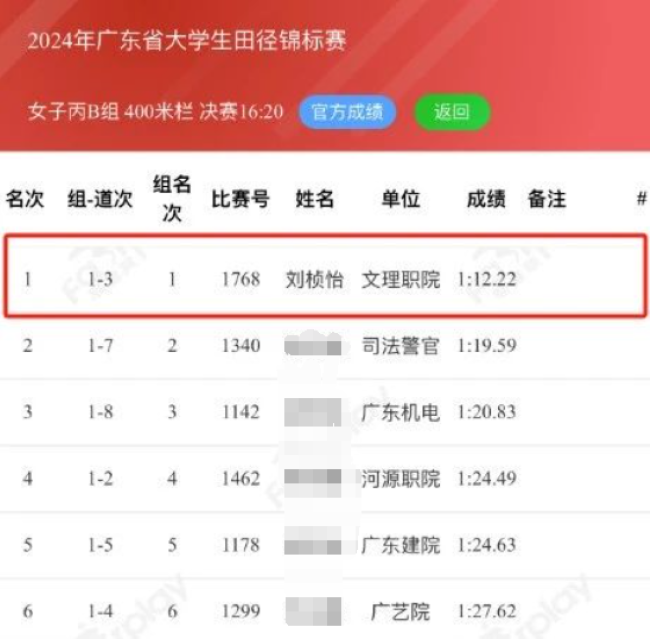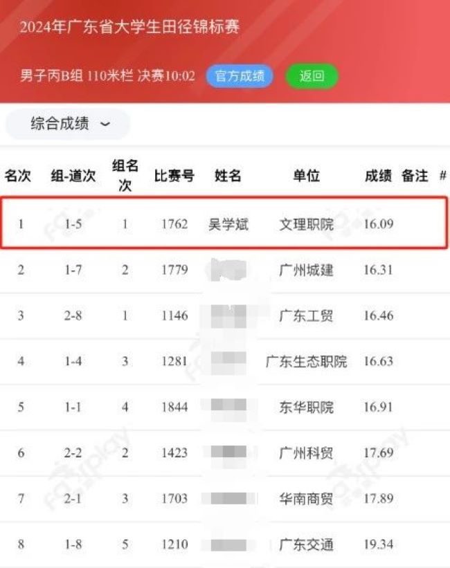 2024年11月30日下午从2024年广东省大学生田径锦标赛现场传来捷报广东文理职业学院在多个比赛中获得多个奖项其中,吴学斌同学蝉联冠军刘桢怡同学勇夺冠军,吴学斌同学蝉联男子丙B组110米栏冠军。