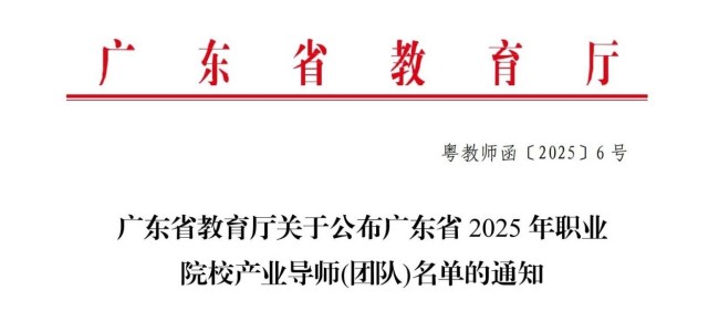 近日,广东省教育厅公布广东省 2025 年职业院校产业导师(团队)名单,其中我校获评省级产业导师团队1个、产业导师1名。这是我校在深化产教融合、校企合作方面取得的新成绩,是我校专业建设成果的展示。