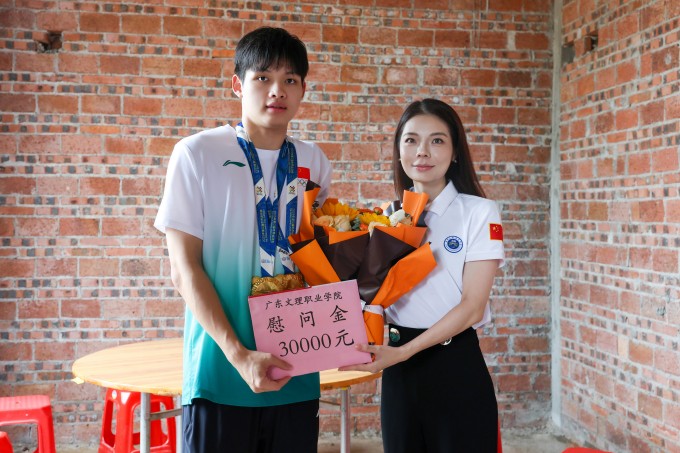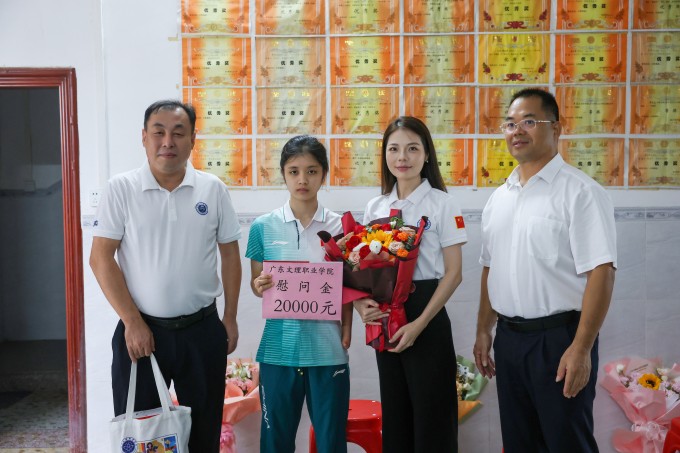 为弘扬体育精神,助力地方体育事业发展。2025年8月18日,学校董事、副校长宣依娜,党委副书记刘春杰率相关部门负责人,专程慰问在第十二届世界运动会中勇夺金牌的廉江籍运动员黄诗雨、龙邓喜。