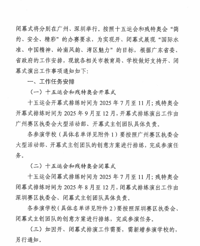 根据安排,十五运会和残特奥会将于2025年11月至12月在粤港澳三地举行。我校学生将参与深圳赛区闭幕式的演出工作。学校将严格按照通知要求,积极配合组委会工作,为呈现一场具有“国际水准、中国精神、岭南风韵、湾区魅力”的精彩盛会贡献青春力量。