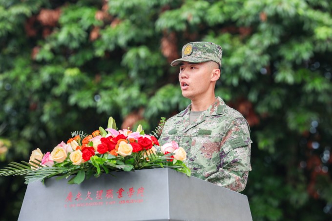 军训教官代表张艺轩作了表态发言表示,将以身作则树立榜样,履职尽责文明带训,温情关怀营造良好氛围,帮助同学们掌握军事技能,养成优良作风。