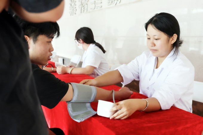 学校健康学院中医康复技术专业学生发挥专业特长,为老师们提供中医脉诊、健康咨询、养生建议、血压测量。