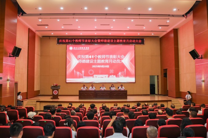 2025年9月10日是我国第41个教师节,广东文理职业学院在学校科技实训中心10楼学术报告厅隆重举行了庆祝第41个教师节表彰大会暨师德建设主题教育月动员大会。学校纪委书记王南福,副校长薛芳,董事、副校长宣依娜,党委副书记刘春杰,校长助理张佐营及全体教职工参加了大会,大会由纪委书记王南福主持。