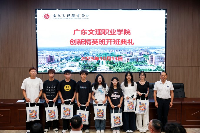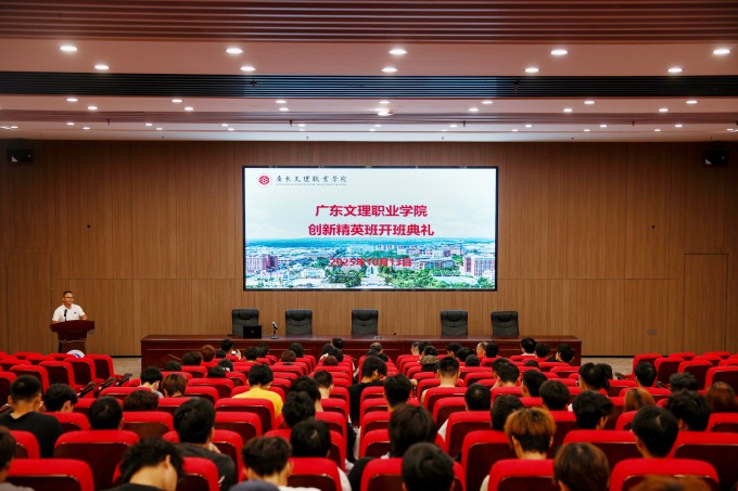 10月13日晚,广东文理职业学院2025级创新精英班开班典礼在第二教学楼学术报告厅举行。校长助理、科研与发展规划处处长张佐营,学生处处长袁远,招生就业指导中心主任林华威,教务处副处长林丽佳,招生就业指导中心综合科副科长黄江,创新精英班教师代表李观荣,各精英班辅导员及全体新生参加典礼。典礼由教务处处长黄桦主持。