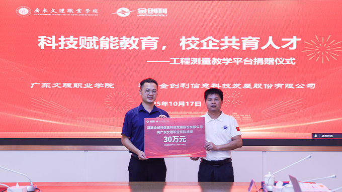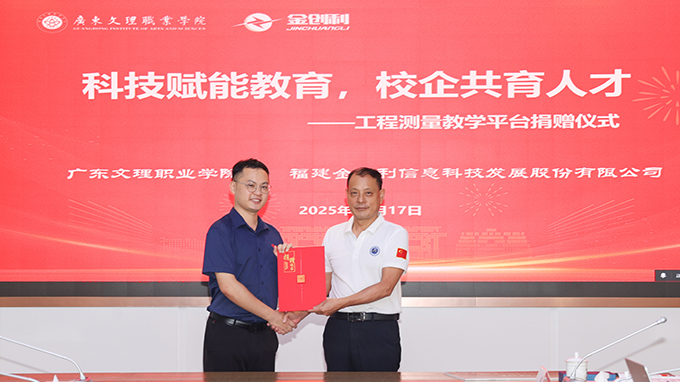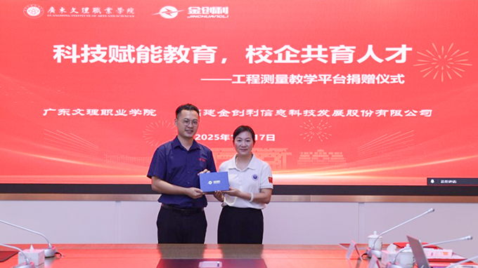 2025年10月17日上午,工程测量教学平台捐赠仪式在广东文理职业学院图书馆七楼视频会议室举行。广州金创利空间科技有限公司教育事业部总监谭峻峰、广东省大区经理陈丽芳,广东文理职业学院校长助理张佐营、实训与社会合作中心主任王达斌、信息工程学院院长马才学、建筑工程学院副院长余莉莉等校企代表出席活动。