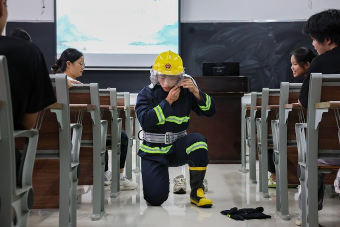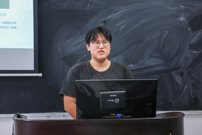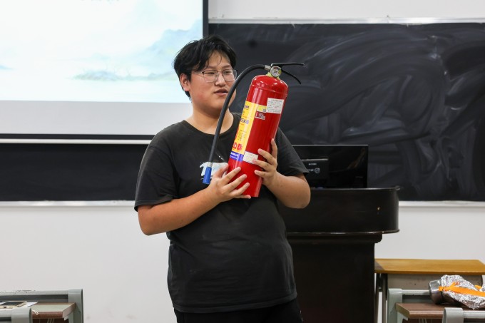 丁冠伦老师以 PPT 形式系统讲解火场自救技巧,从逃生路线选择、防护措施使用,到灭火器、消防栓等常见消防器材的原理与用途,进行深入浅出的解析,让同学们对消防安全知识形成全面认知。