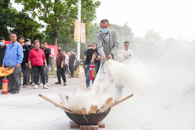 在实战演练环节中,全体员工在专业指导下,分批次操作灭火器,对准模拟火源进行扑救。整个过程组织严密、反应迅速、操作规范,达到了预期效果。