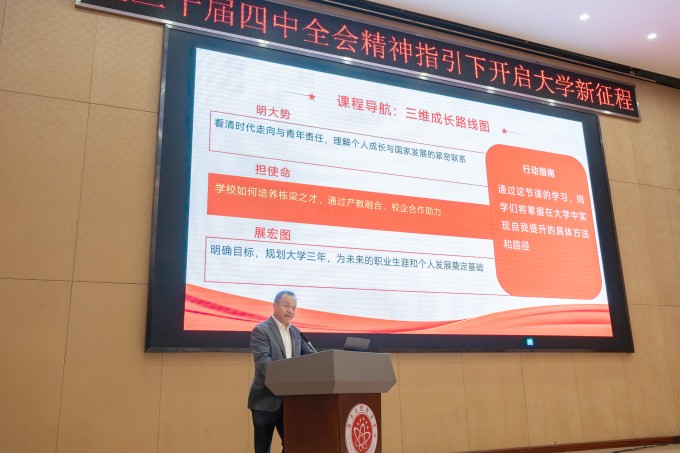 在 “时代东风已至” 篇章,李德豪教授结合党的二十届四中全会精神与 “十五五” 规划蓝图,深入解读了技术技能人才在中国式现代化进程中的关键作用。他强调,当前我国正处于战略机遇与风险挑战并存的关键时期,完整产业体系与丰富人才资源为职业教育发展提供了广阔舞台,新能源、人工智能、低空经济等新兴产业与未来产业的蓬勃发展,迫切呼唤高素质技能青年投身其中。课程还专门科普了中央全会的召开机制与职能分工,帮助新生理解国家发展战略的顶层设计逻辑。