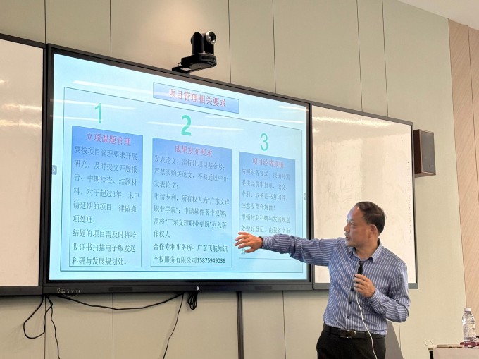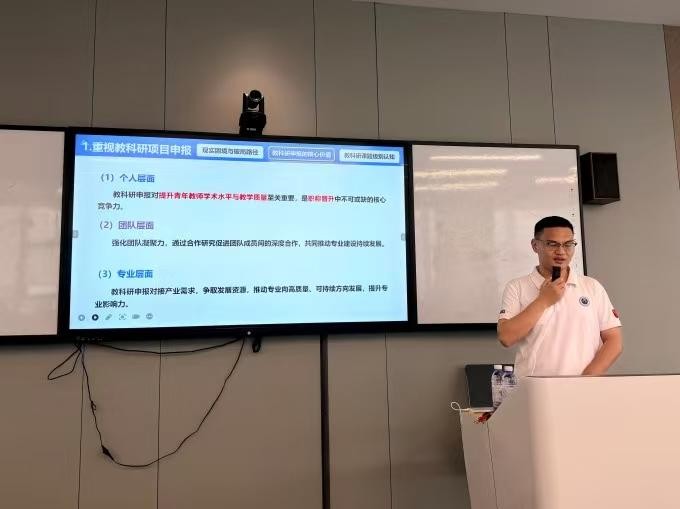 活动邀请学校校长助理兼科研与发展规划处处长张佐营教授、优秀青年教师代表皇甫生鸿担任主讲嘉宾。张佐营教授从宏观战略与个人发展相结合的角度,系统阐述了教科研工作在新时代背景下的重要意义。他强调,高水平的教科研项目不仅是教师专业发展的引擎,更是学校对接产业前沿、培育办学评估关键标志性成果、提升整体影响力的核心路径。结合学校发展需求与近年项目数据,张佐营教授特别指出,我校科研应秉持“实用性”导向,落脚点在于有效“反哺教学”。通过将产业真实案例、技术创新成果系统转化为教学资源,科研能够直接驱动课程内容更新与教学模式改革。同时,他分析了从项目选题到成果产出的全链条,如何切实支撑“双师型”教师队伍的全面建设:一方面,依托应用型研发项目,助力教师提升专业实践与技术服务能力;另一方面,积极发挥“传帮带”作用,在共同科研中促进青年教师整体成长,形成能力递进的团队结构。张佐营教授强调,科研工作的开展,将有助于教师个人科研规划与学校整体发展目标更紧密地结合。科研与发展规划处将持续优化其引导与支持服务,协助青年教师探索将个人发展与学校战略相融合的科研路径。