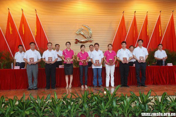 会议由党委副书记王南福主持。大会在庄严雄壮的《国歌》声中开始,随后新新党员在鲜红的党旗下光荣宣誓加入中国共产党;新党员代表邓佩婷同志发言表示,要努力学习,勤奋工作,为党和人民的事业贡献青春和力量;党委委员、后勤处长宣承柱同志宣读上级党委的表彰决定,学院管理系党支部被广东省教育工委评为先进基层党组织;学院党委被湛江市直属机关工委评为优秀党委;学院机关支部被评为先进党支部;钟华、金泽莲、吴为三名同志被评为湛江市优秀党员,罗发香同志评为党务工作者;党委委员、宣传部长毕德勇同志宣读了学院党委的表彰决定;学院党委对3个先进党支部、8名优秀党务工作者、43名优秀共产党员进行表彰。