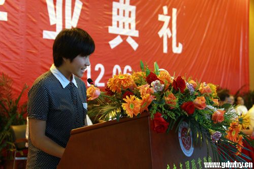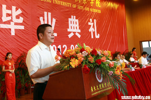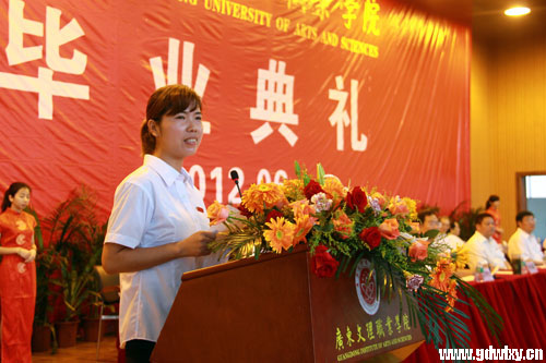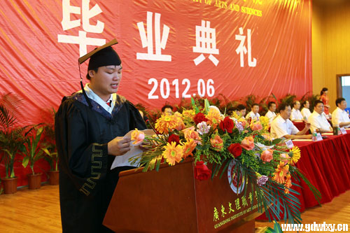 毕业生代表文迪在发言中说,三年前,稚气未脱的我们踏进了湛江现代科技职业学院的校门,而今当我们实习归来,学院已经教育部批准更名为广东文理职业学院,我们就荣幸的成为了首届毕业生,这无疑令每一个广文院人欢欣鼓舞。大学三年,我们学会了做人与做事,学会了分析与思考,学会了丰富与凝练,学会了合作与竞争,学会了继承与创新,也学会了如何不断超越、突破自我而成长。