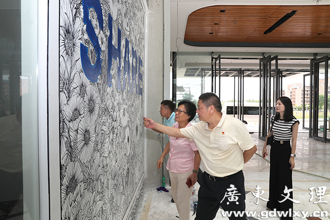刘菊主任对图书馆学生艺术壁画颇感兴趣