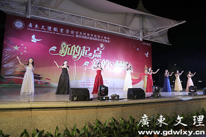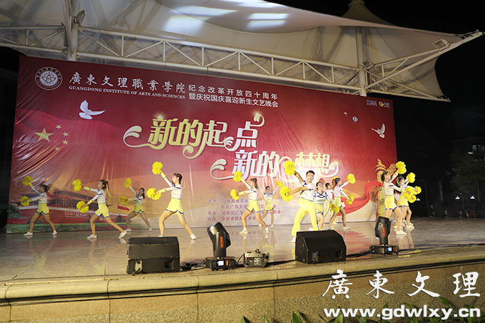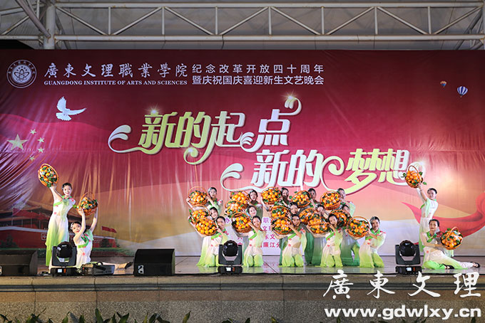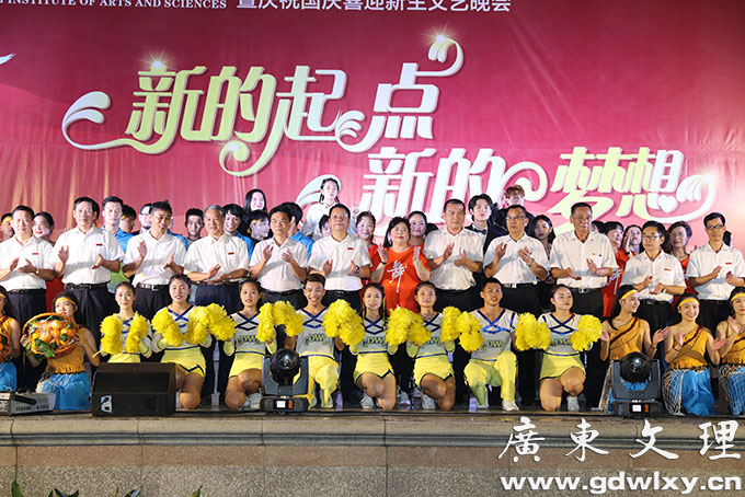 金秋十月,举国同庆,神州大地,繁花似锦。为庆祝祖国六十九岁的生日迎接2018届新生入学,9月29日晚,以“新的起点,新的梦想”为主题的迎新文艺晚会,在广东文理职业学院篮球场隆重举行。学院董事长宣承志,学院董事会董事蓝小云,党委书记颜大胜,国际教育学院院长宣依娜,常务副院长刘周堂,副院长王南福,副院长龙成和,副院长汪富泉,副院长郝世栋等学院领导与各职能部门,各系院负责人以及全校师生一同观看了演出。晚会由王勇杰、江时姝同学主持。