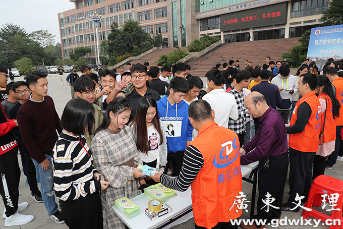 在教学楼广场的活动现场,医务人员积极向同学们宣传普及艾滋病基本知识、传播途径、如何预防艾滋病以及如何识别和避免艾滋病的相关高危行为等。同时邀请了廉江市疾病预防控制中心黄权庆老师为学生上了一堂《艾滋病防控知识》课。详细的讲解了当前我国艾滋病防控形势及艾滋病预防知识。本次活动摆放宣传展板15块,发放宣传资料 3000余份,免费赠送宣传纸巾500多盒。