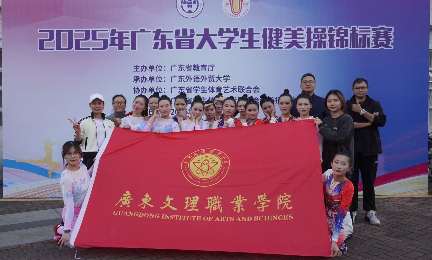 广东文理职业学院校健美操队共派出15名运动员参加丙组3个项目的比赛,队员们刻苦训练,团结一致、努力拼搏,在赛场上用激情四溢的表演与活力满满的竞技状态,赢得现场裁判的认可,经过激烈的角逐,学校健美操队表现出色,最终获得丙组一项第二名(广东省校园竞技健美操基础套路),一项第三名(徒手健身操)和一项第六名(广东省校园健身操系列推广套-初级)的好成绩!